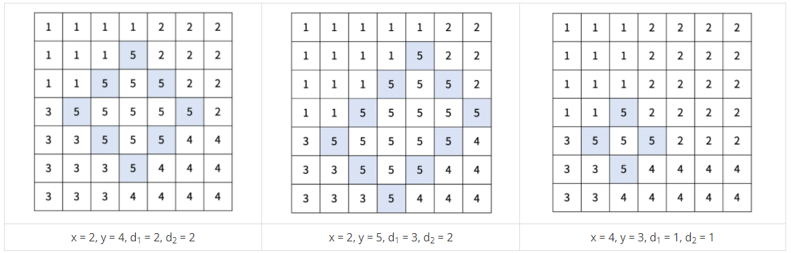 - 기준점 (x, y)와 경계의 길이 d1, d2를 정한다. (d1, d2 ≥ 1, 1 ≤ x < x+d1+d2 ≤ N, 1 ≤ y-d1 < y < y+d2 ≤ N)