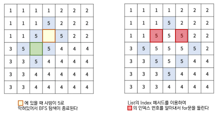 - BFS 사용해서 5는 벽, 비어 있는 곳은 이동할 수 있다고 생각할 때, 노란색에서 시작하면 초록색으로 못 넘어간다.