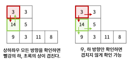 - 2차원 배열의 모든 인덱스에 대해 상하좌우로 확인하면 중복되므로, 오른쪽, 아래 방향만 확인한다. (DP처럼)