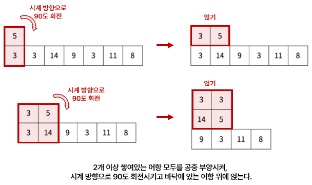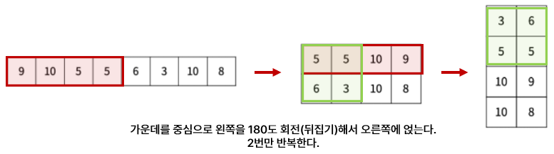 - 가운데를 중심으로 왼쪽 N/2개를 공중 부양시켜 전체를 시계 방향으로 180도 회전 시킨 다음, 오른쪽 N/2개의 위에 놓는다.
