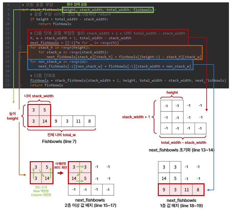 - 어항을 이동시킨 후 상황을 전 상황에 대한 변수로 표현하여 2차원 빈 리스트를 만들고, 빈 리스트에 순차적으로 값을 입력한다.