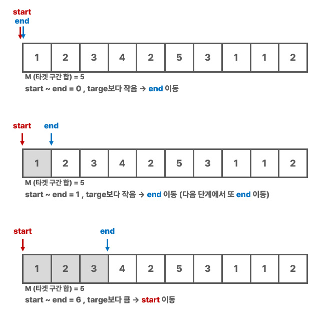 - 합이 M보다 크면 start를 오른쪽으로 이동하여 합을 감소시킨다.