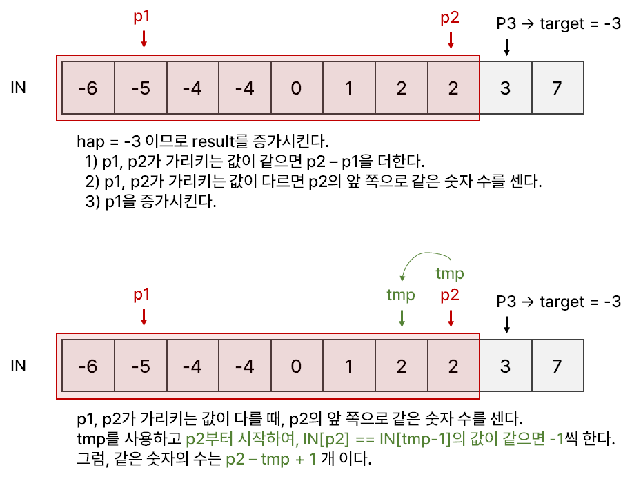 - p1, p2가 가리키는 값이 다르면 result에 p2와 같은 수의 개수 만큼 더한다. [-4(=p1), 0, 2, 2, 2(=p2)] 이면 +3