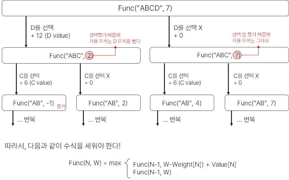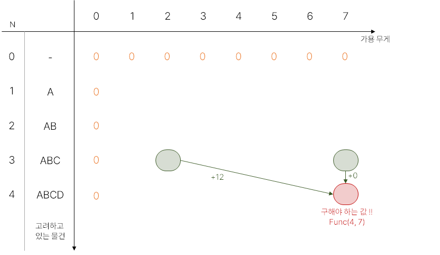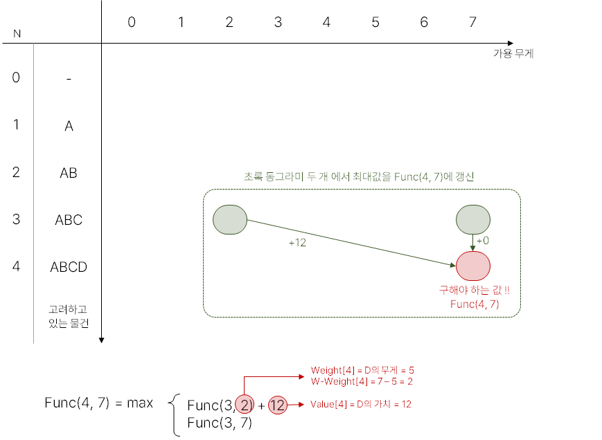 빨간 동그라미인 Func(4, 7)은 Func(3, 2) + 12와 Func(3, 7) 중 큰 값을 선택하면 된다.