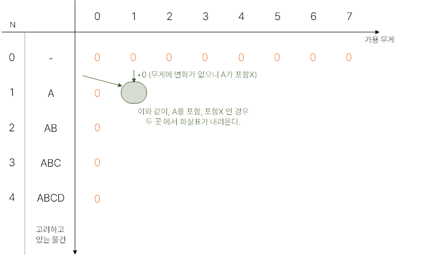 이 경우, 가용 무게가 넉넉하여 물건을 선택할 수 있을 경우 왼쪽에서 화살표가 오고, 물건을 선택할 수 없을 경우 바로 위에서 화살표가 온다. 두 화살표의 최대값으로 갱신하면 된다.