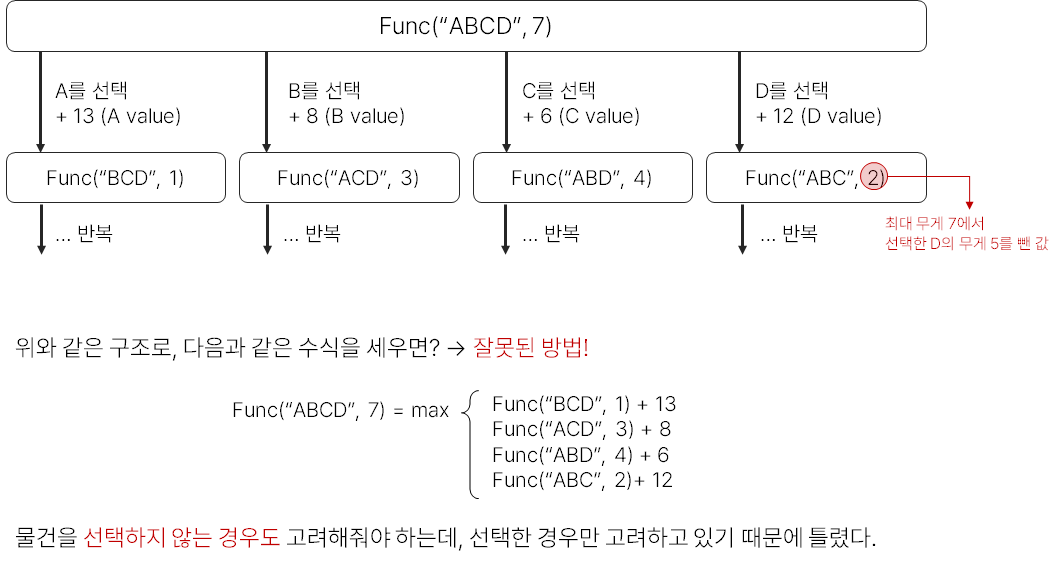 동적 계획법 (DP) 는 복잡한 문제를 간단한 여러 개의 문제로 나누어 푸는 방법이다. 이 문제 역시 간단한 작은 문제로 나누어 풀 수 있다. 하지만 아래와 같이 실수를 할 수 있으니 조심할 것. 해당 내용들은 이 곳 / 코딩테스트, 중급, knapsack problem 내용을 정리한 것이다.