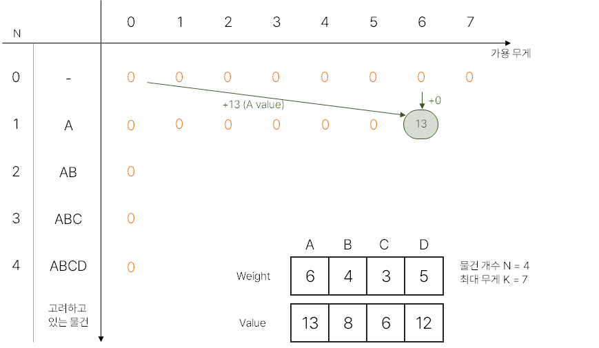 실제 문제에선, A를 처음 선택할 수 있는 경우가 무게 6일 때 이므로 초록 부분에 13이 처음 갱신된다.