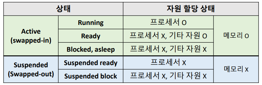 - Swap-out (suspended) : 메모리를 빼앗겨서 메모리 이미지를 사진찍어 저장하는 것