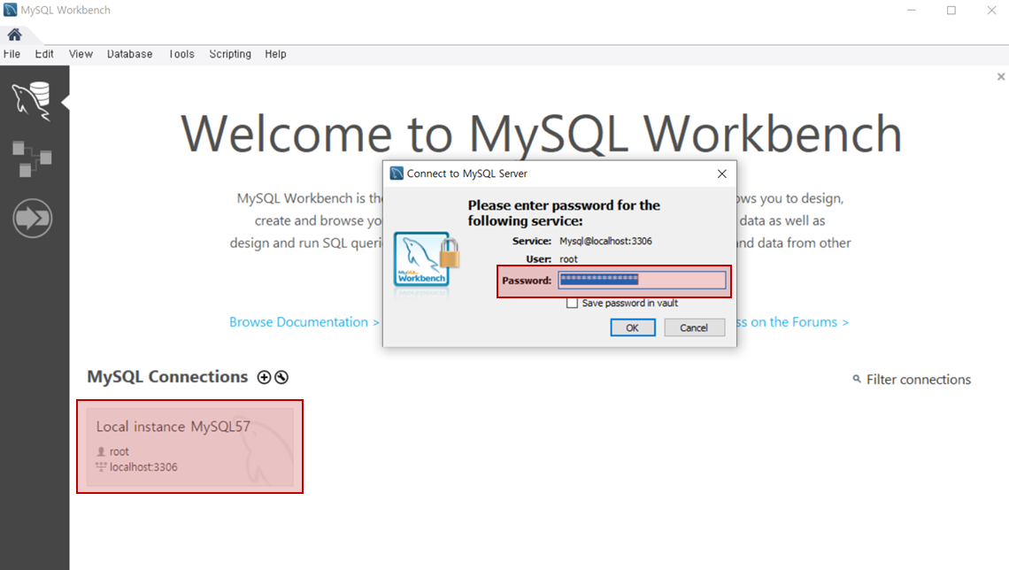19. workbench의 경우, MySQL connections에 있는 탭을 누르면 연결 창이 뜹니다. 기존에 설정했던 비밀번호를 입력하면 접속이 가능합니다.