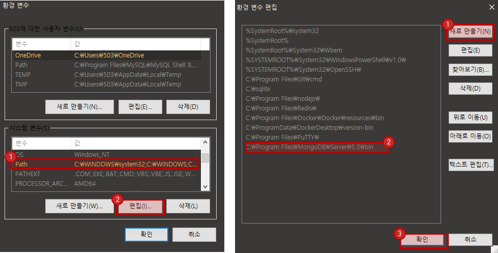 - 시스템 변수 Path에 C:\Program Files\MongoDB\Server\5.0\bin 추가