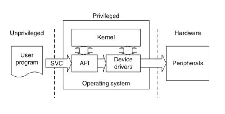 - 아래 그림에서 user program이 어떠한 명령어도 다 실행시킬 수 있으면 누군가 악의적인 목적으로 사용할 수 있다. 그래서 user program에는 권한이 제한되는데, 그 때문에 SVC를 통해 supervisor에게 명령을 수행해달라고 부탁하는 것이다. (kernel mode = supervisor mode)