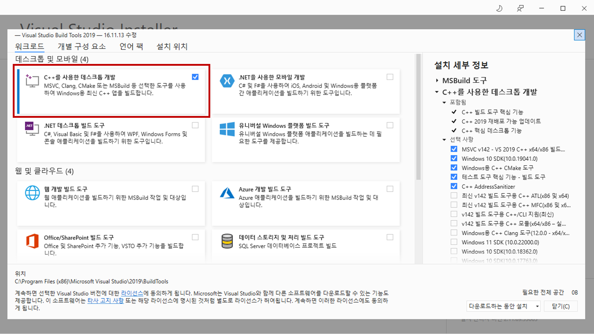 어쨌든 빌드 도구를 다운받은 후, C++을 사용한 데스크톱 개발을 체크하고 설치하면 된다.