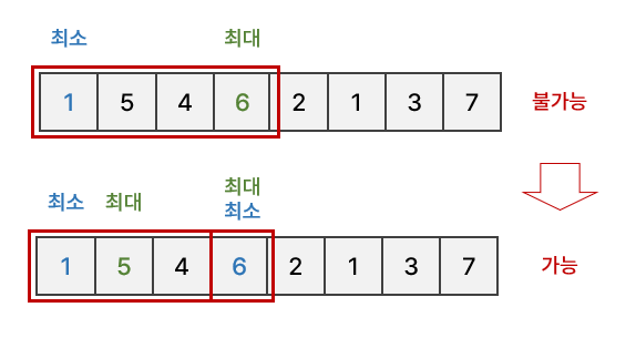앞에서부터 배열을 탐색하며 최솟값, 최댓값을 기록해두고, 해당 값이 구간의 점수 최댓값 이하인지 확인한다. 아래 예시에서, 최소 1, 최대 5 이므로 구간의 점수는 4이고, 우리가 설정한 최댓값 이하이므로 가능하다.