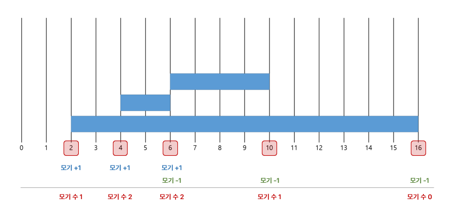 처음 defaultdict를 사용하지 않고, list를 사용해서 [(모기가 들어온 시간, 1), (모기가 나간 시간, -1), ...] 처럼 저장을 했더니 92%에서 틀렸다. 모기가 들어온 시간과 나간 시간이 같을 때 모기의 수는 변함없으므로 연속으로 판단해야 했는데, 그것이 되지 않아서 틀린 것이었다. (이 경우 예제에서도 틀림)