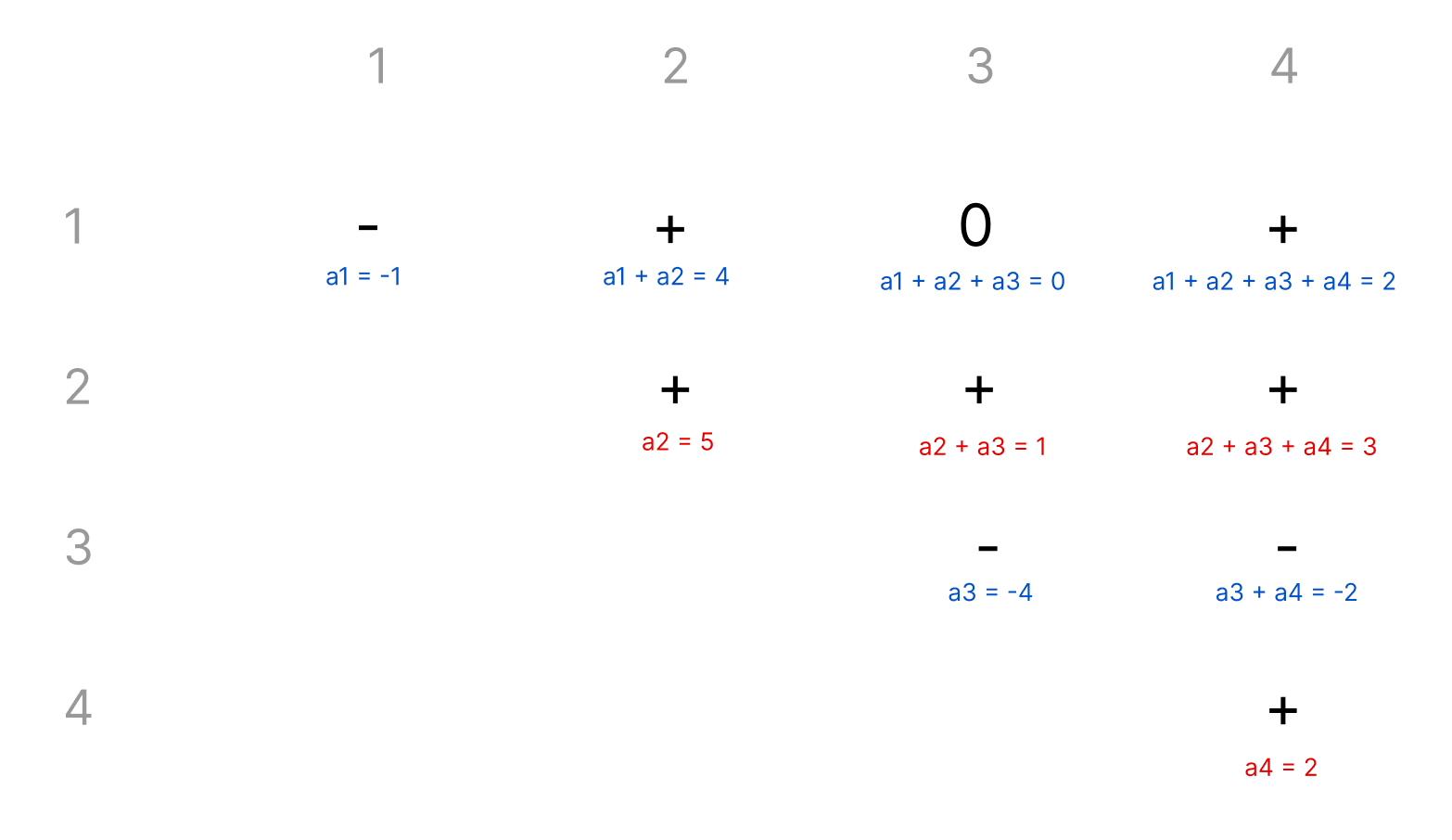 예를 들어 (a1, a2, a3, a4) = ( −1, 5, −4, 2) 가 주어지면 sign matrix는 다음과 같다.