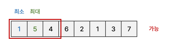 앞에서부터 배열을 탐색하며 최솟값, 최댓값을 기록해두고, 해당 값이 구간의 점수 최댓값 이하인지 확인한다. 아래 예시에서, 최소 1, 최대 5 이므로 구간의 점수는 4이고, 우리가 설정한 최댓값 이하이므로 가능하다.