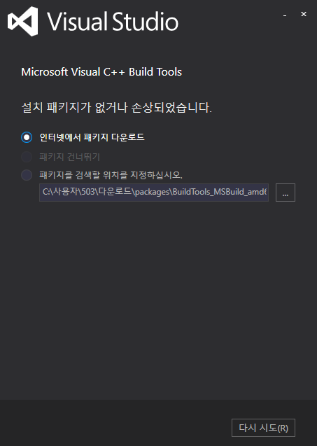 Microsoft Visuaal C++ Build Tools 설치 패키지가 없거나 손상되었습니다.