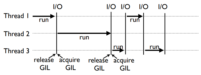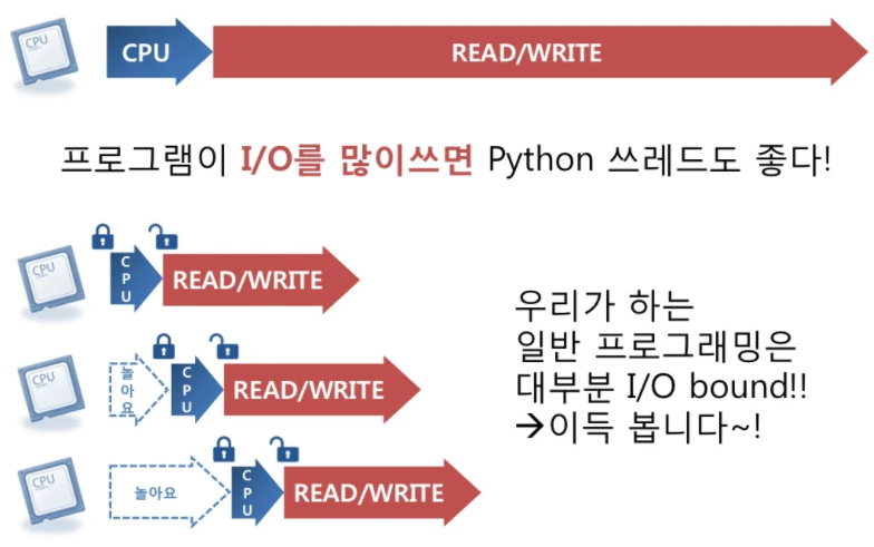 그래서 파이썬의 경우 멀티 스레딩을 바라고 사용해도 효율이 잘 안 나올 때가 있다. 하나의 스레드가 GIL을 가지고 있다가 release 되고 다른 스레드가 GIL를 얻어야만 일을 할 수 있기 때문이다. 심지어 그 사이에 context switching 때문에 overhead가 늘어나서 역효과가 날 수도 있다.
