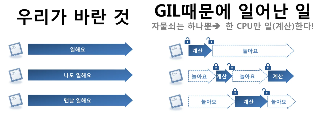 애초에 왜 이렇게 만들었냐고 하면 Python을 처음 개발할 때 당시 CPU는 한 개 여서 멀티 코어를 고려하지 않았고, 스레드라는 개념 자체가 희미했다고 한다.