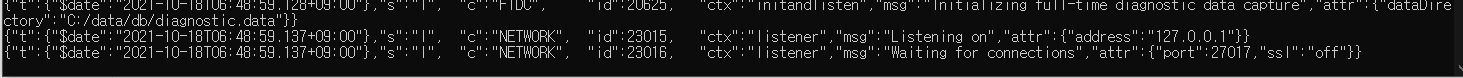 - cmd창에서 mongod 실행 => 27017 (default) port 연결 대기