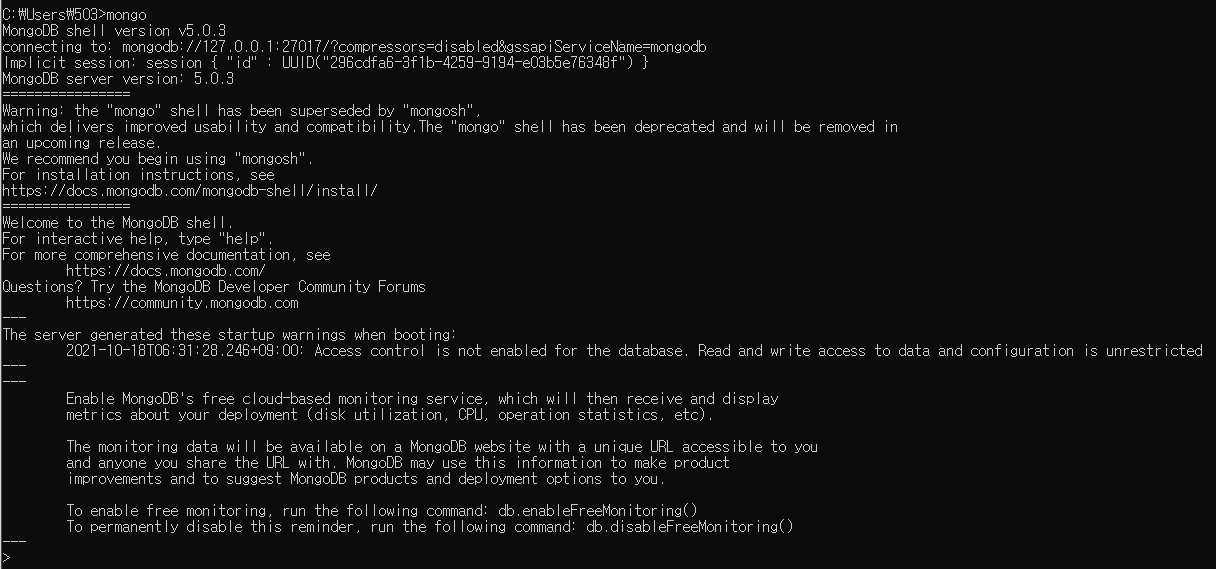 5. 잘 설치 됐으면, cmd에 mongo입력(Client 신분으로 mongoDB에 접속)하면 shell로 넘어간다.