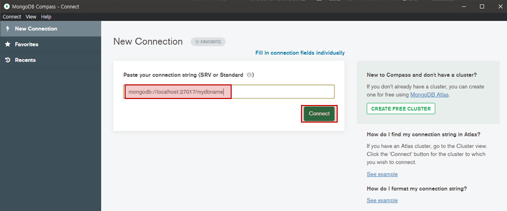 1. mongodb://localhost:27017/mydbname 입력 후 connect
