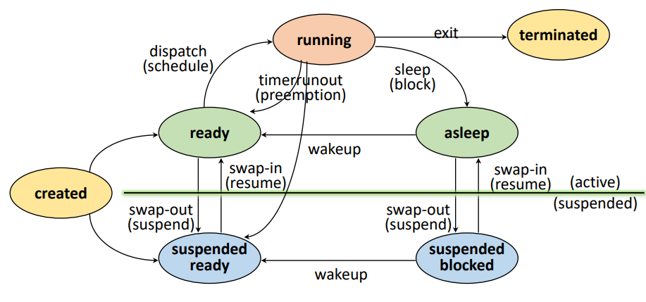- Swap-out (suspended) : 메모리를 빼앗겨서 메모리 이미지를 사진찍어 저장하는 것