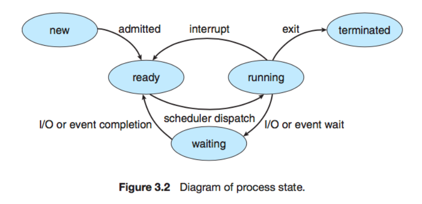 - 프로세스 상태(Process State): 생성(create), 준비(ready), 실행(running), 대기(waiting), 완료(terminated) 상태이다. 유예준비상태suspended ready, 유예대기상태suspended wait는 스택이 아닌 disk에 저장된다.