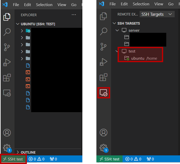 좌측 하단에 SSH:test로 연결된 것을 확인할 수 있으며 사이드 바 버튼을 눌러 탐색할 수 있습니다.