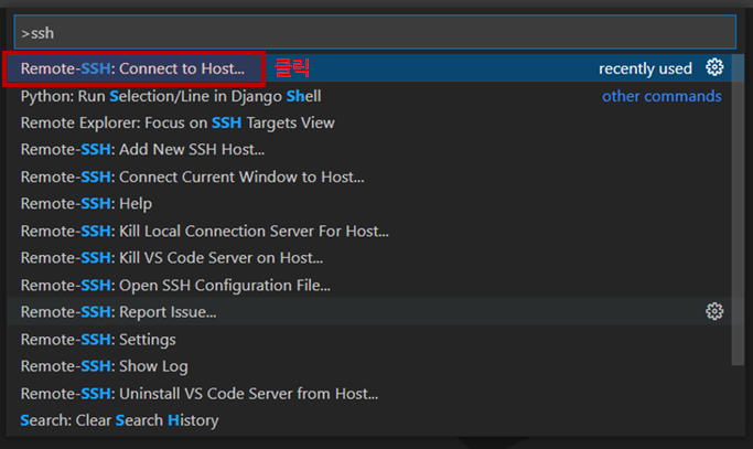 F1을 누르고 ssh를 입력하여 Remote-SSH: Connect to Host... 를 찾아 클릭합니다.