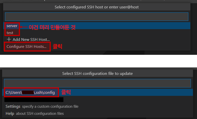 Configure SSH Hosts...를 클릭합니다. 위에 server, test는 기존에 제가 미리 만들어둔 것 입니다.