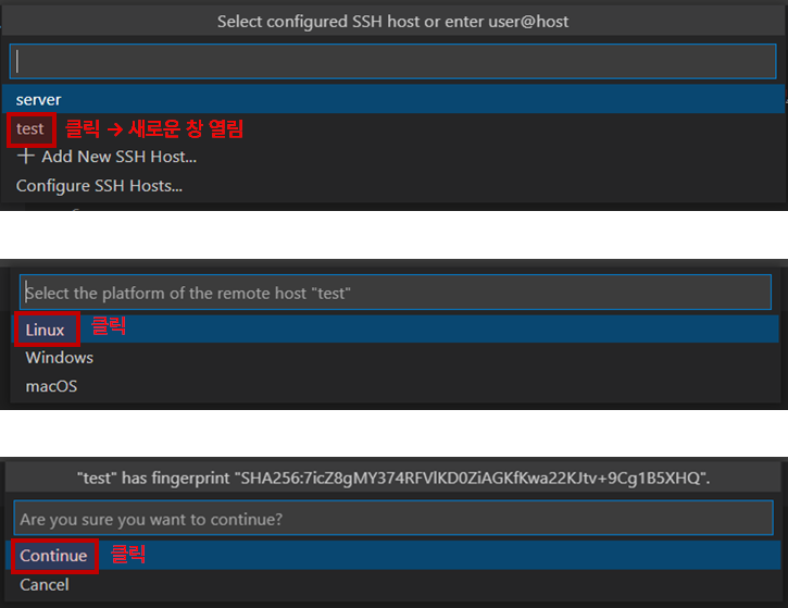 연결할 서버를 선택하면 새로운 창이 열립니다. Linux 와 continue를 순서대로 클릭하면 연결이 완료됩니다.