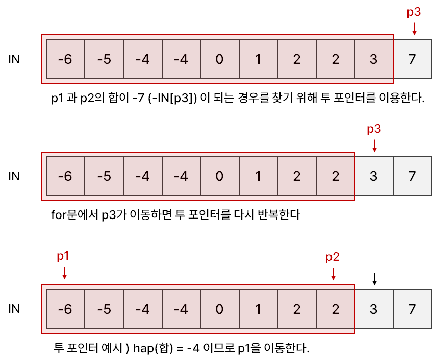 - 나머지 두 사람의 코딩 실력 합은 -k가 되어야 하며, 이 부분에서 투 포인터를 사용한다.